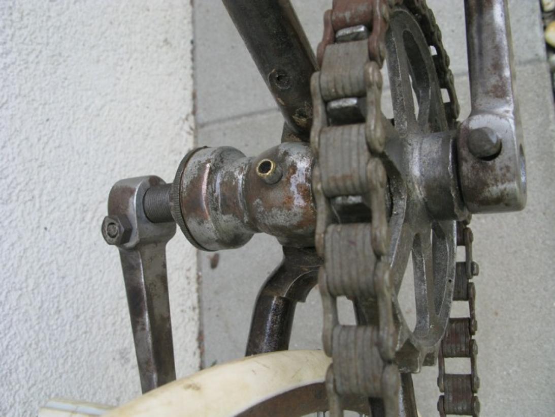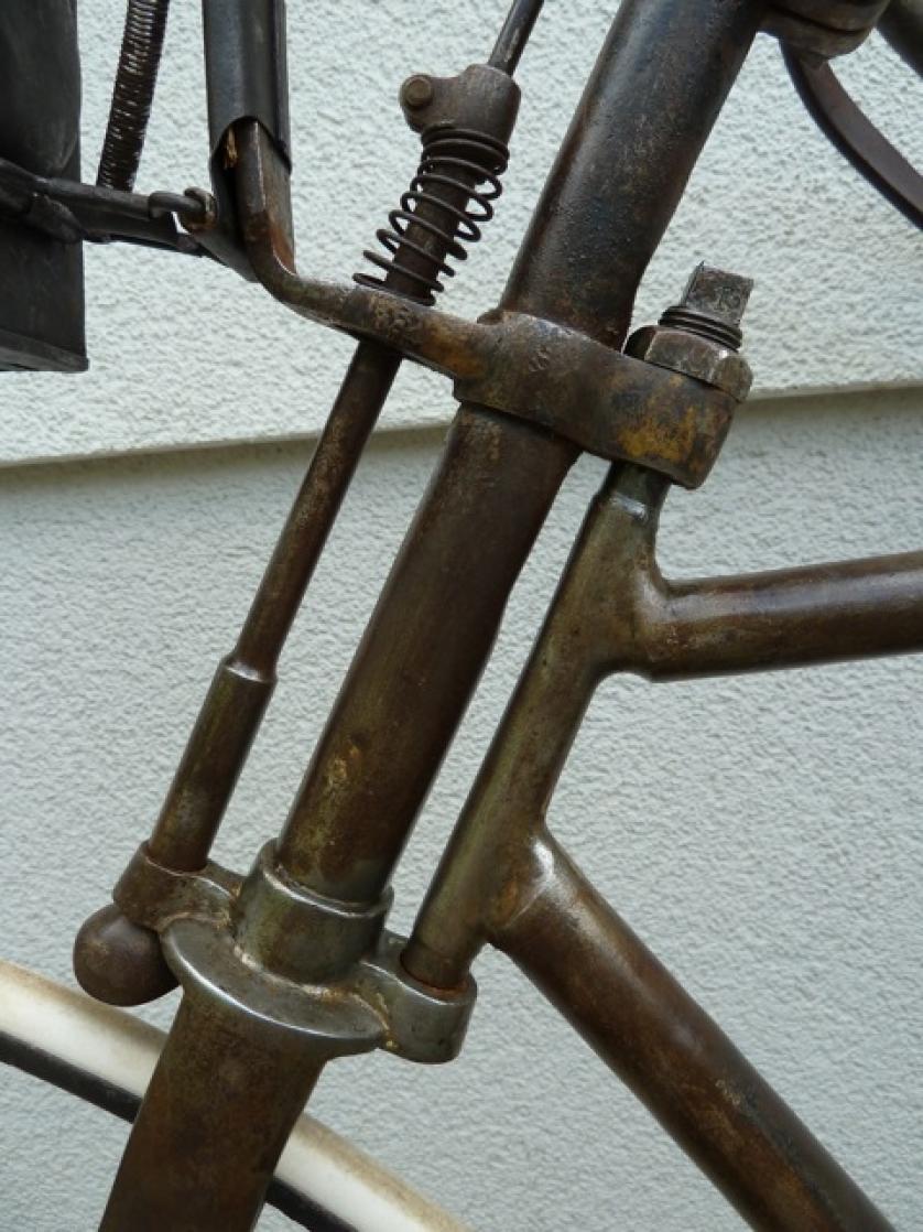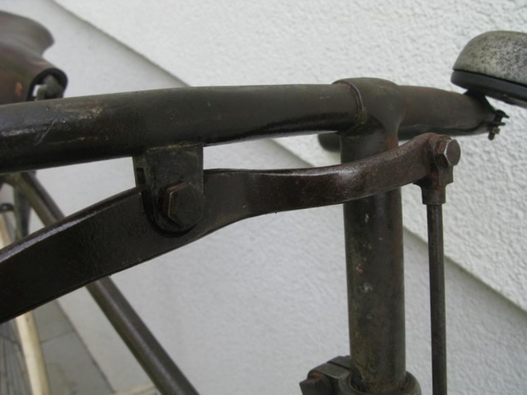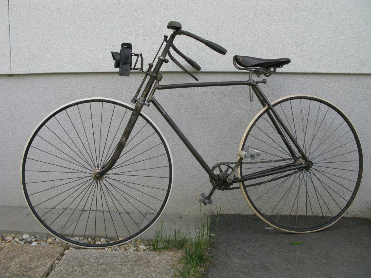 This beautiful bicycle shows the search of manufacturers for the perfect bicycle frame. It was built approximately 1890-1891 and only two years later experiments like this belonged to the past: everyone built the diamond frame with saddle tube, like we still know it. Look at the interesting mount of the bracket, which was also used to adjust the chain tension.